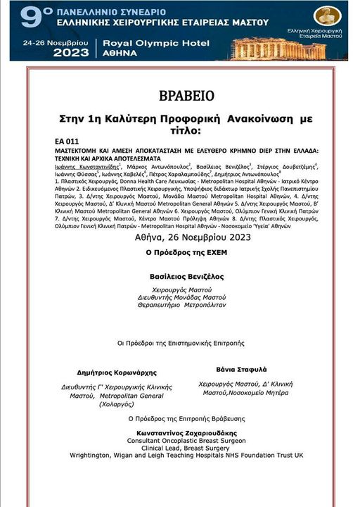 Η εργασία μας με τίτλο “Μαστεκτομή και Άμεση Αποκατάσταση με Ελεύθερο Κρημνό DIEP στην Ελλάδα: Τεχνική και Αρχικά Αποτελέσματα” έλαβε το 1o Βραβείο ως η καλύτερη προφορική ανακοίνωση στο 9ο Πανελλήνιο Συνέδριο της Ελληνικής Χειρουργικής Εταιρείας Μαστού που ολοκληρώθηκε πρόσφατα με πολύ μεγάλη επιτυχία.